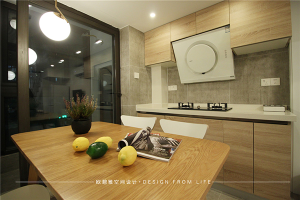 设计师利用有限的空间创造无限的可能,将客厅、餐厅、厨房进行三者合一,不仅可以避免各种边际空间的共同使用,还可以达到空间使用的最大化,视觉互通,空间感扩大。为了保证后期的油烟扩散,设计师在客厅与餐厅和厨房之间增加了移门,既保证了空间宽阔又控制了油烟问题,使整个空间既有静谧诗意,更有恬然的自然气息。